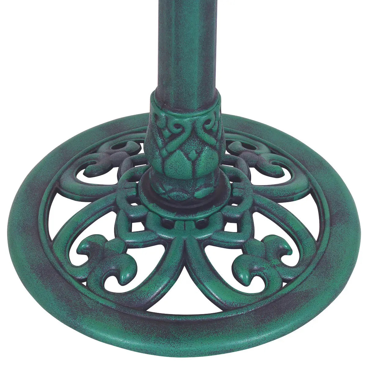 Attractive copper verdigris effect this pedestal bird bath is constructed of tough weather and frost-resistant resin! Features decorative Fleur-de- Lys accents, scroll work, and heart-shaped designs on base and hexagonal pedestal. Generously sized bowl is embellished with scalloped shapes inside and out; 2'' depth is perfect for allowing smaller birds to bathe. Small rectangular ''cut-outs'' along edge of bowl allow birds of all sizes to easily perch.