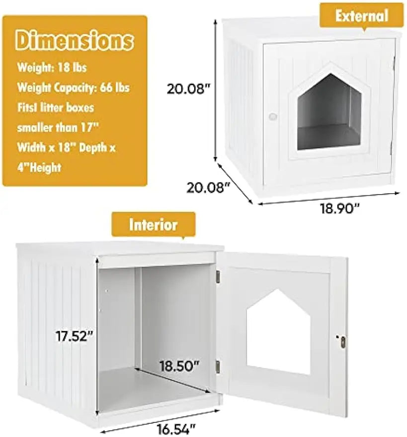 This hidden kitty box is to provide your cat with a comfortable and private space to do their business while keeping your home clean and odor-free. Say goodbye to unsightly litter boxes and enjoy a more elegant and convenient way to care for your feline friends!Smart Design: Featuring a decorative door which provides your cats easier access to their litter box, while 9 Pre-cut holes in the back panels allow properly air flow to keep the inside dry and fresh; Furthermore, the wide opening door is large enough to insert a cat bed or cleaning the interior.