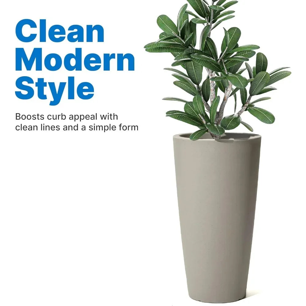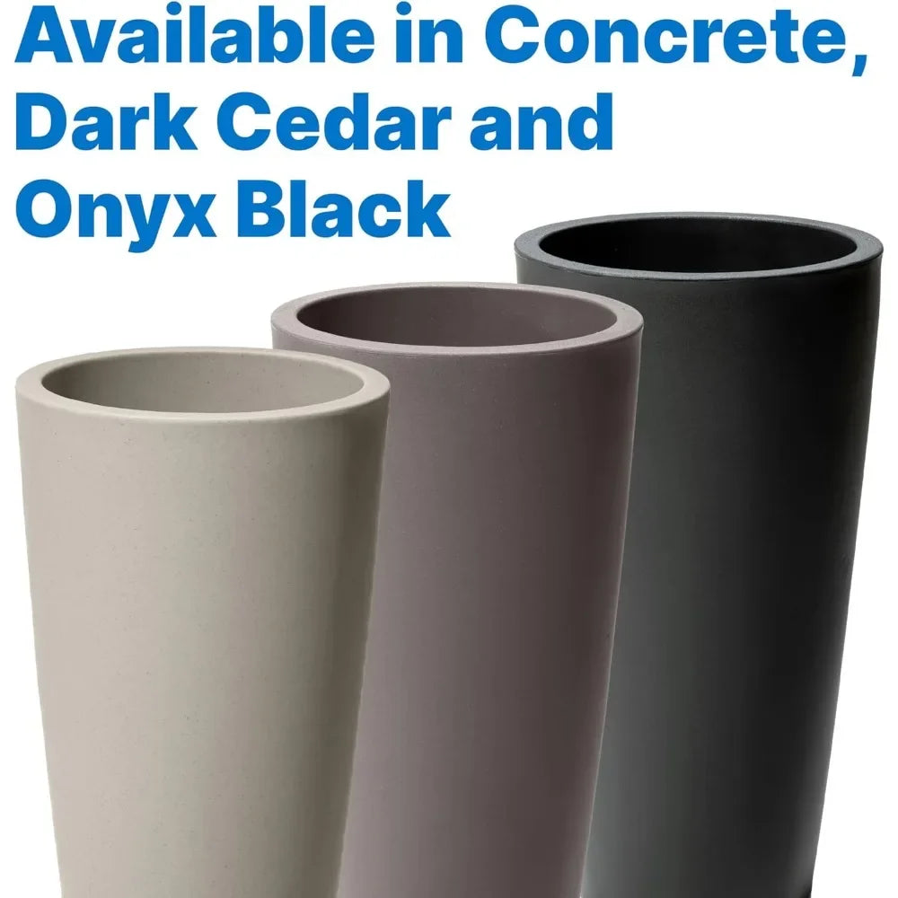 About this itemTALL PLANTER: Update your home's appearance with fresh plants in this beautiful Round Indoor and Outdoor Planter. Measuring 15 in. x 15 in. x 28 in., the planter looks stunning on your porch, patio, or even indoors.CUSTOMIZABLE DRAINAGE: The self-watering, sub-irrigation feature on this large planter encourages healthy root growth and allows for even moisture. Drill points allow for optional drainage if placed in a rainy environment or for certain plant types.PREMIUM DETAILS: Thoughtfully designed, the refined Outdoor and Indoor Planter will complement the beauty of your plants and flowers for years to come. The pot explores the beauty of clean lines and form.DURABLE CONSTRUCTION: Made from our high-quality, double-walled resin construction with colors molded-in, this tall outdoor planter will never chip, fade, rust, or tarnish. The lightweight Planter is designed for year-round enjoyment.FULLY ASSEMBLED: Add color and fresh plant life to any indoor or outdoor space as soon as your self-watering planter arrives at your home. It comes fully assembled and ready to use (potting soil and plants not included).