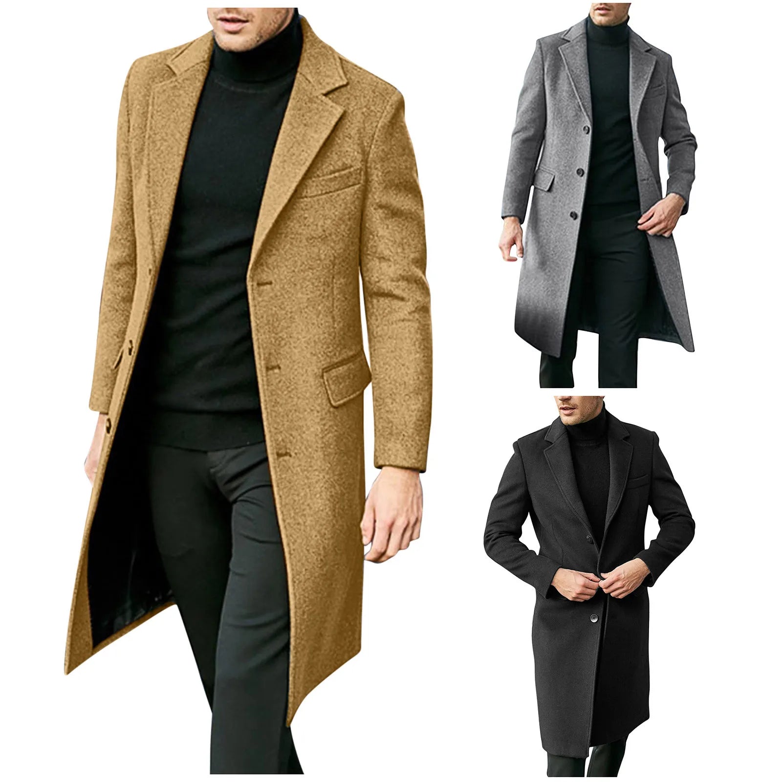 Men's British Style Solid Color Long Warm Woolen Overcoat